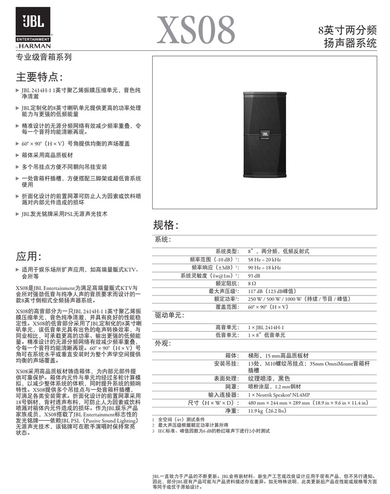 JBL KTV音响 JBL音响 卡拉OK音箱 KTV酒吧 娱乐音箱 JBL XS系列 级音箱系列 JBL一直致力于产品的不断新。 JBL会将新材料、产工艺或改良设计应用于现有产品,但不另行通知。...